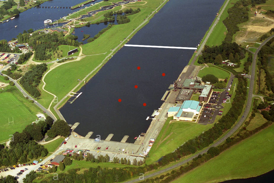 The lake has a gravel sloping bank and so no backwash. On the right side of the course will be a long pontoon to prevent waves affecting the course. We plan to have the course laid out by GPS mapping.